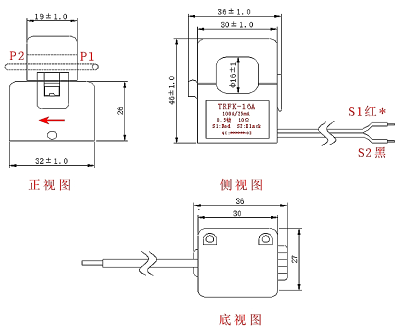 | 二次引线 | 两芯2464-24#-2CAWG红黑护套线 | 公差 | ±1.0 mm | |